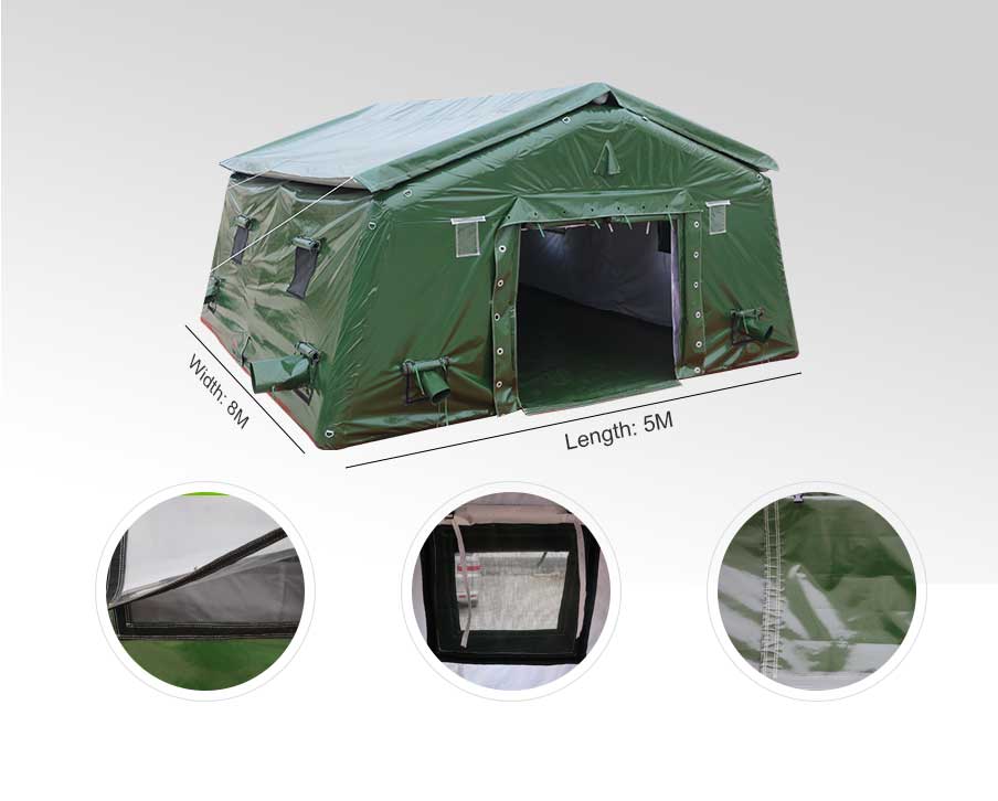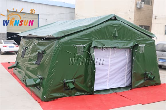 Green or White Inflatable Military tent is made by very strong and durable 0.9mm PVC Tarpaulin material which makes the inflatable medical tent can be well used in very tough circumstance like desert or cold weather. It can resist wind of 17m/s and can be well used from-35℃to +65℃.